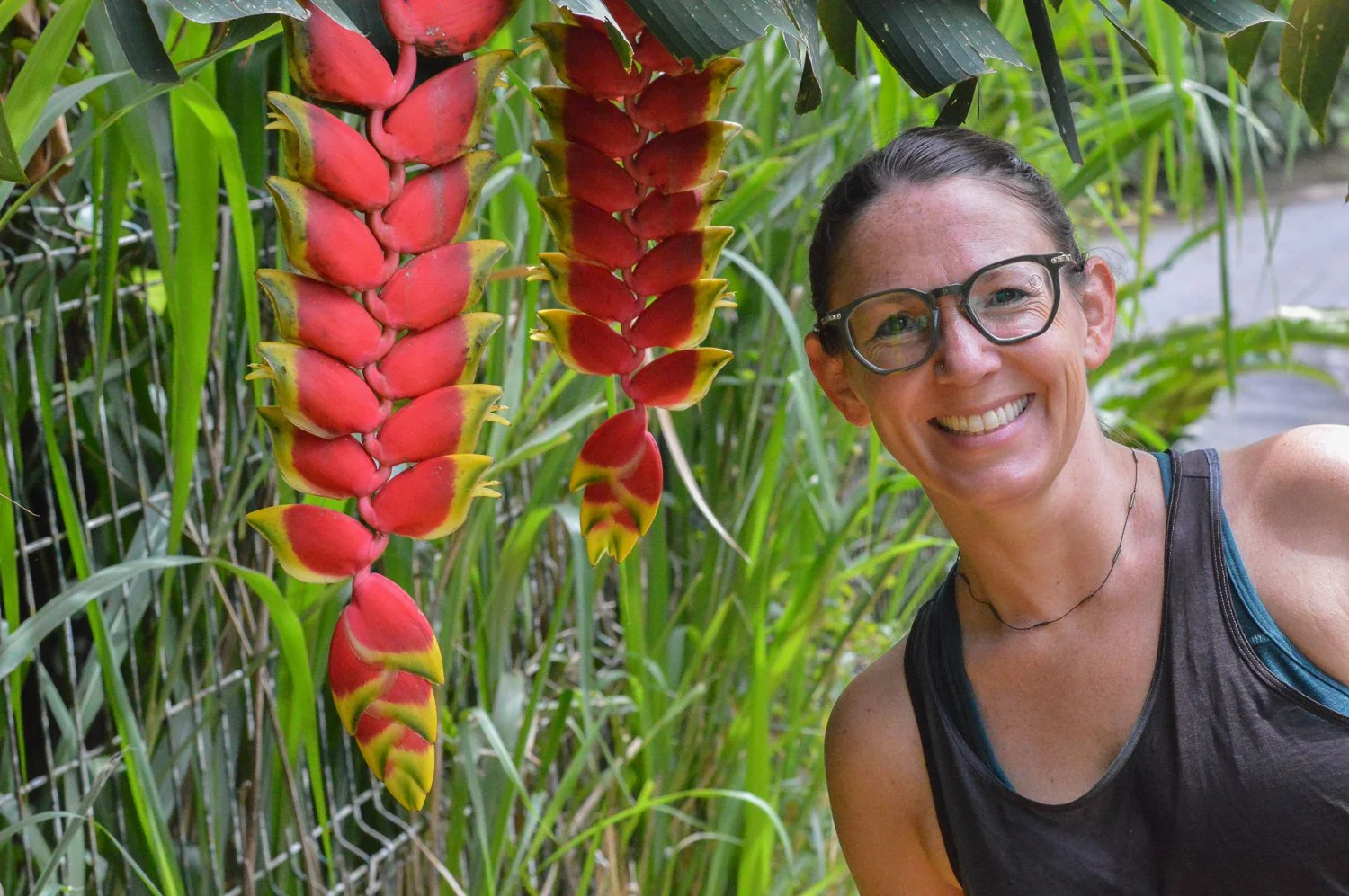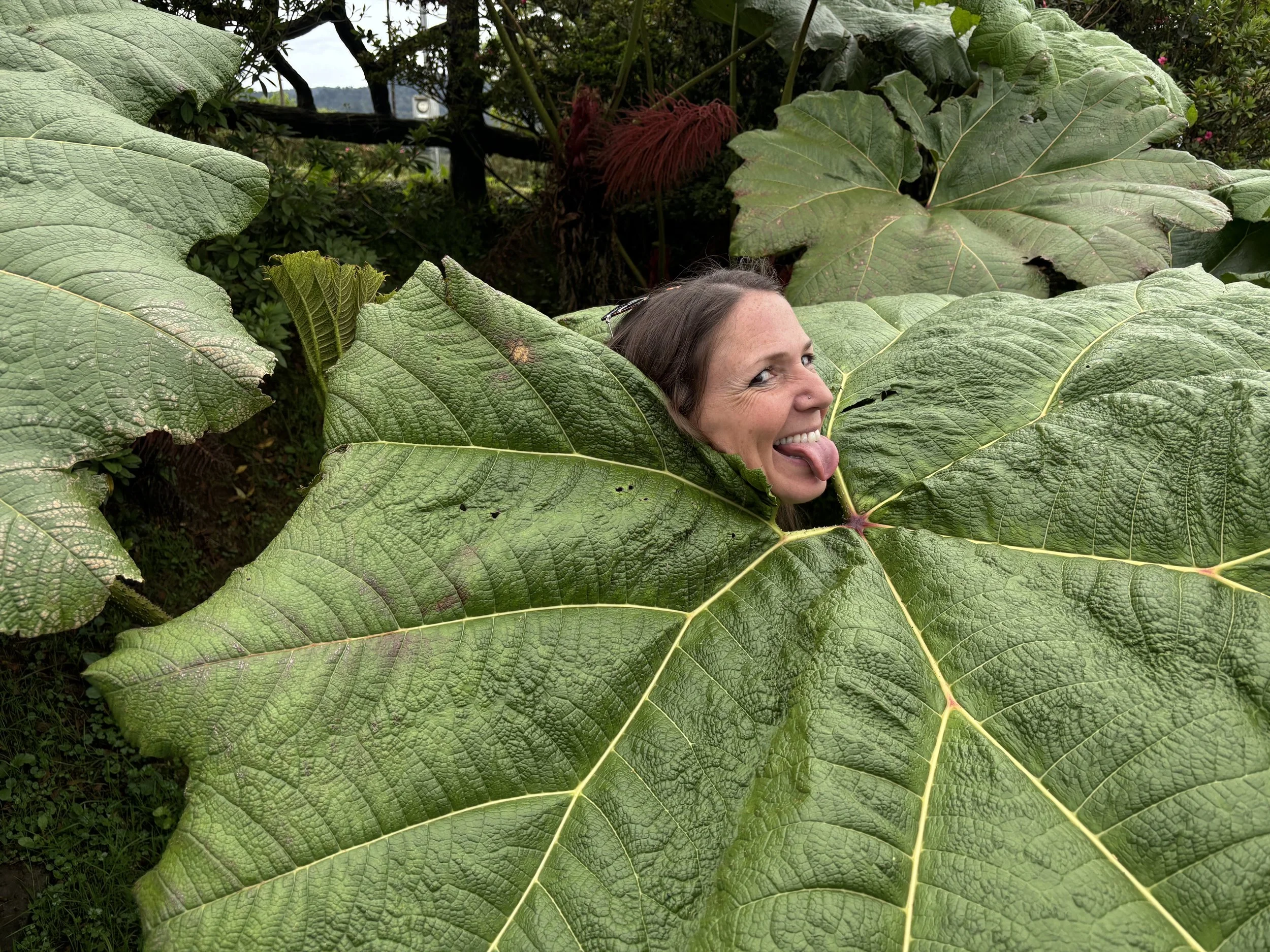 Our adventure started immediately. On the very long drive from the airport in San Jose to our hotel just outside of La Fortuna, we stopped on the side of a windy mountain road to let Michele stick her cute little face in the largest leaf I’ve ever seen.